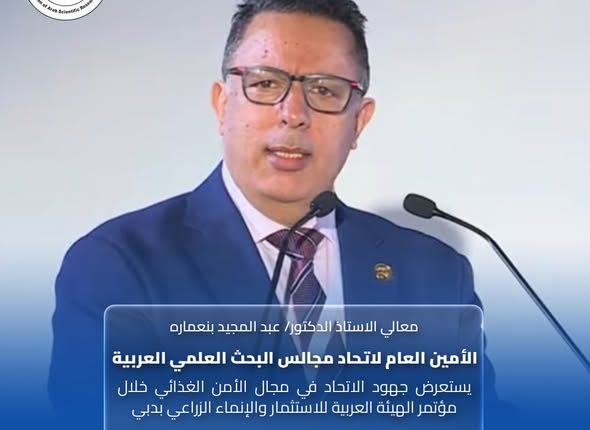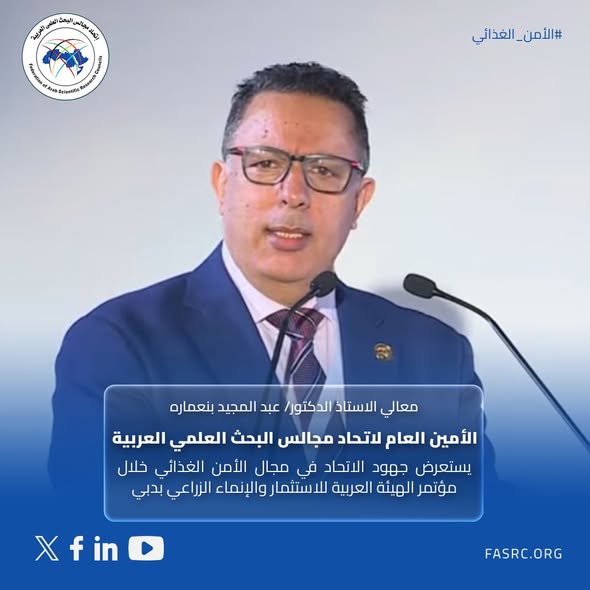 اتحاد مجالس البحث العلمي العربية يستعرض جهوده في مجال الأمن الغذائي خلال مؤتمر الهيئة العربية للاستثمار والإنماء الزراعي بدبي