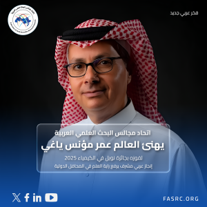 يتقدّم اتحاد مجالس البحث العلمي العربية بخالص التهاني إلى العالم عمر مؤنس ياغي، السعودي من أصول أردنية -فلسطينية، بمناسبة فوزه المستحق بجائزة نوبل في الكيمياء لعام 2025 تقديرًا لإسهاماته الرائدة في تطوير الكيمياء الشبكية والهياكل المعدنية العضوية (MOFs).