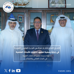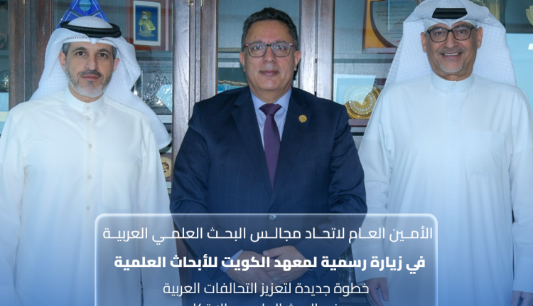 في إطار التنسيق لإطلاق النسخة الثانية من مبادرة التحالفات العربية للبحث العلمي والابتكار، التقي الأمين العام لاتحاد مجالس البحث العلمي العربية معالي الأستاذ الدكتور عبد المجيد بن عمارة، لقاءً علمياً رفيع المستوي مع سعادة الأستاذ الدكتور فيصل الحميدان، مدير عام معهد الكويت للأبحاث العلمية.