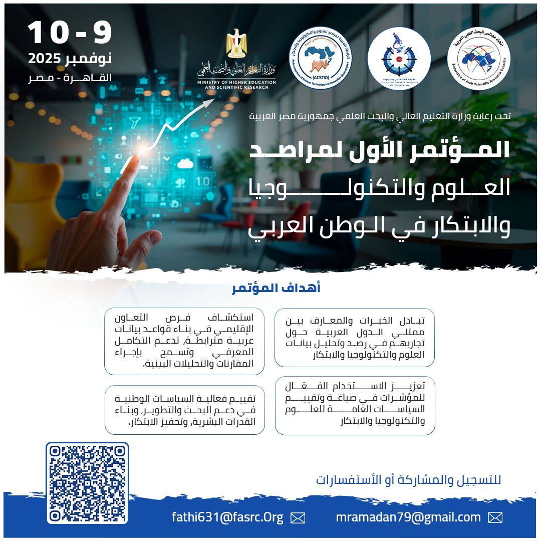 يسر اتحاد مجالس البحث العلمي العربية بالتعاون مع أكاديمية البحث العلمي والتكنولوجيا الإعلان عن انعقاد المؤتمر الأول لمراصد العلوم والتكنولوجيا والابتكار في الوطن العربي، وذلك يومي 9–10 نوفمبر 2025 بالقاهرة.