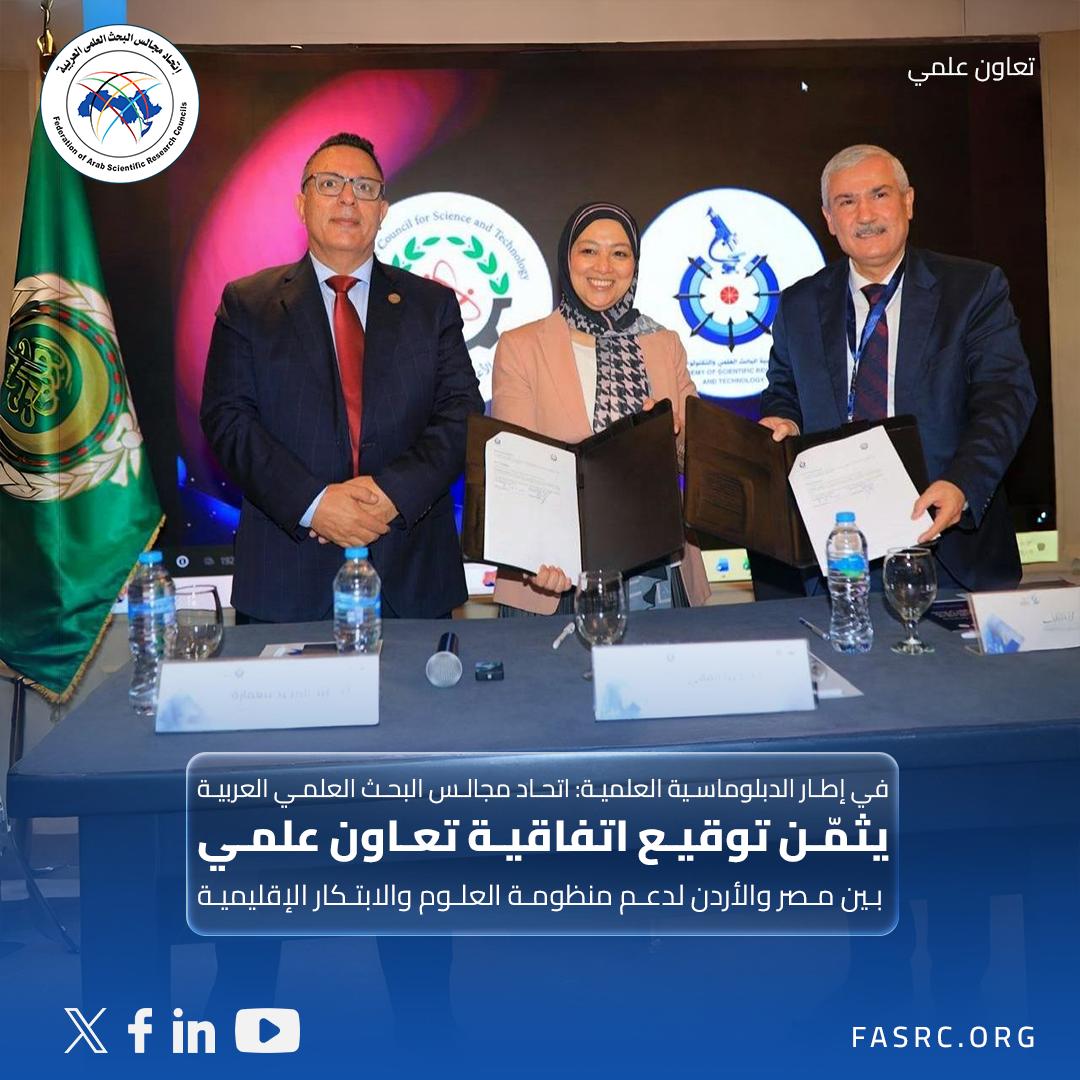في إطار الدبلوماسية العلمية: اتحاد مجالس البحث العلمي العربية يثمّن توقيع اتفاقية تعاون علمي بين مصر والأردن لدعم منظومة العلوم والابتكار الإقليمية